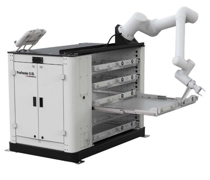 ProFeeder X-XL is a spacious and versatile robotic platform—it allows you to place it on any type of equipment, like a CNC machine or a conveyor. It is 500mm wider than the standard ProFeeder X and is available with 2 or 5 trays, making it a high capacity robot cell for CNC operations.