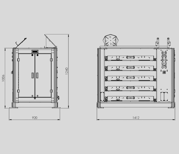 | PFX-2101-05 | PF X-XL 5× 90 kg tray w. Airlock | H: 1050 mm, W: 1420, L: 920, Wt: 700 kg, 5× 780×620 mm tray area, 2,5 mm deflection at 90 kg, Max part height 160 mm, Air-lock |